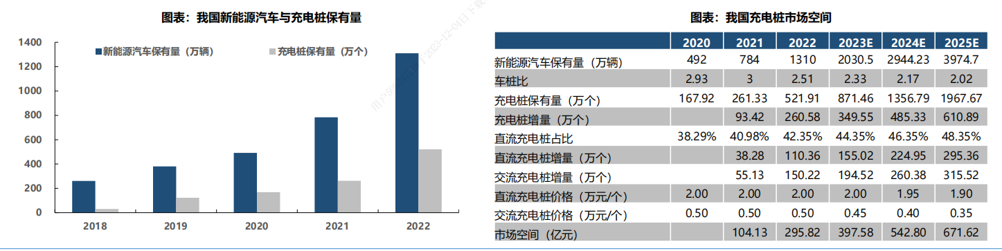 近年来新能源汽车渗透率持续攀升,快速增加的保有量推动充电桩等相关配套设施需求不断提升。但是,尽管我国在电动车充电桩领域有着领先低位,但国内车桩比仍存在结构失衡的问题。2022年,我国车桩比为2.51:1,未来发展潜力巨大。假设到2025年车桩比降至2.02;据测算,对应的充电桩市场空间将达到672亿元。