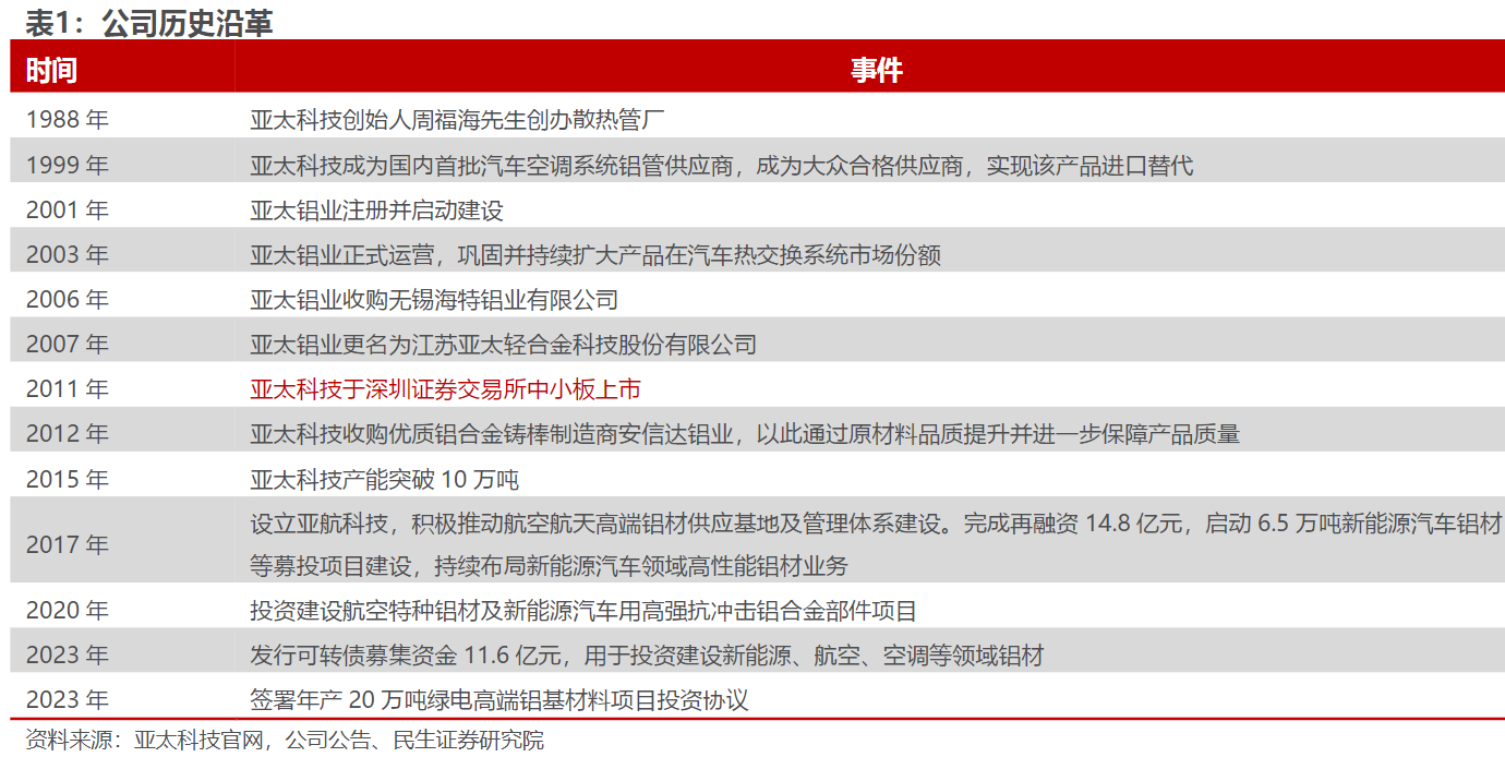 公司是铝挤压材龙头企业,三十余年持续深耕铝材产品研产销,是汽车、航空航天、轨道交通等工业领域的优质供应商,2017年完成再融资14.8亿元,启动6.5万吨新能源汽车铝材等募投项目建设,持续布局新能源汽车领域高性能铝材业务,继续扩大产能规模;公司自成立至今致力于为客户提供更高性能、更优品质的铝材产品,成为全球汽车行业铝材重要供应商,是国内汽车铝挤压材特别是汽车热交换系统零部件原材料的龙头企业。