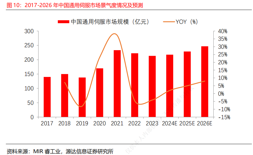 分类上,控制器主要分为基于PC的运动控制器、专用控制器和可编程逻辑的PLC控制器,目前广泛使用的是PLC控制器。具体应用上,大型PLC主要用于项目型市场,小型PLC主要用于OEM市场,2023年市场空间分别为87和74亿元。鉴于中大型PLC对品牌要求高,国产突破难度大,小型PLC相对准入门槛低,因此中大型PLC表现好于小型PLC。驱动层方面,2023年国内通用伺服市场规模约213亿元。展望2024年,消费电子、电池、半导体和工业机器人等行业景气度逐步恢复,国内通用伺服市场有望继续增长。