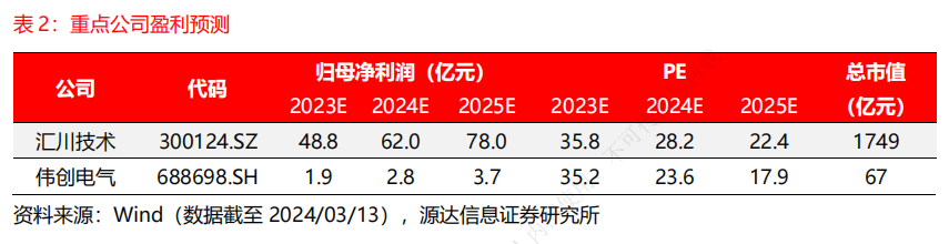 上市公司投资机会方面,汇川技术是工控领域的领军企业,在2023年工控行业景气度不佳的情况下,公司穿越周期业绩保持稳健增长。伟创电器专注于电气传动和工控领域,产品覆盖变频器、伺服和PLC等产品。公司积极布局海外业务,已在海外形成较为完善的经销网络,并凭借俄乌战争窗口期快速切入海外市场,推动公司海外板块营收高速增长。