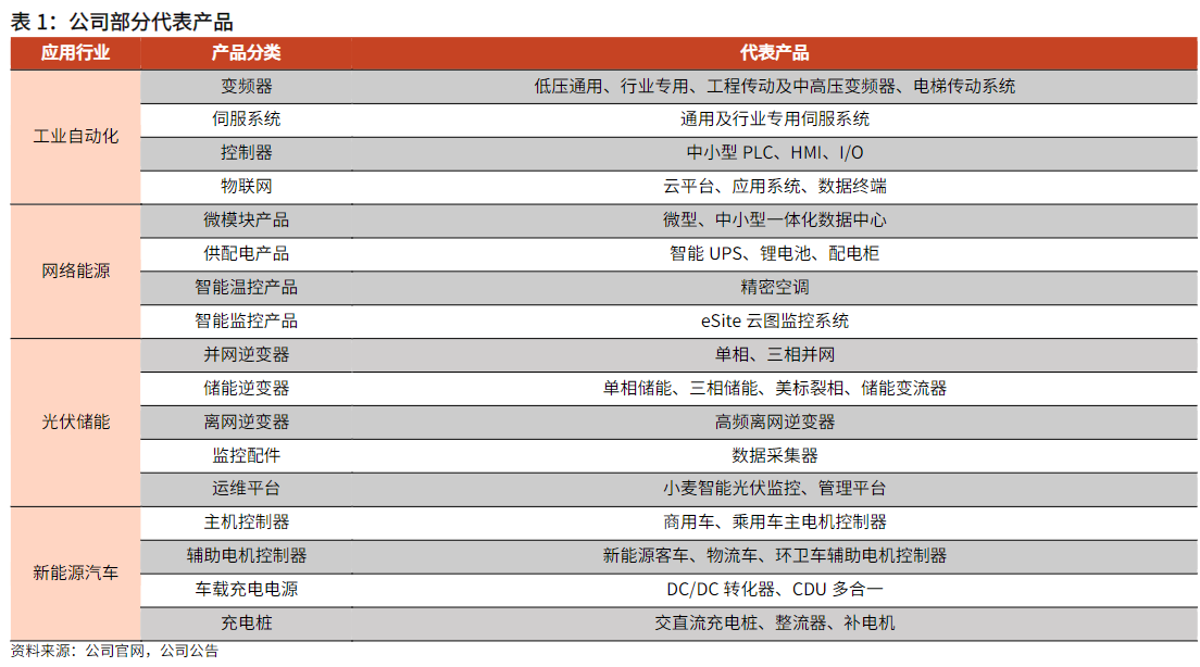 公司深耕变频器领域多年,集团化模式下业务范围持续拓宽公司由变频器产品起步,上市以来业务范围逐步拓宽,上市以来依托于电力电子、自动控制、信息技术领域的多年积累,主要产品包括变频器、伺服系统、光伏逆变器、UPS、新能源汽车电控以及轨道交通牵引系统等。