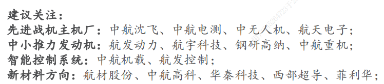 一方面,先进战机的主力作战装备将以高效率低成本为新需求,中型五代机迎来重大发展机遇。另一方面,无人机开始走向高空高速隐身时代,全新代次无人机或将出现。产业链来看,先进战机和无人机的供应链相对重叠,五代战机和新型无人机的定型量产,将为供应链各个部段的企业提供新的机遇。
