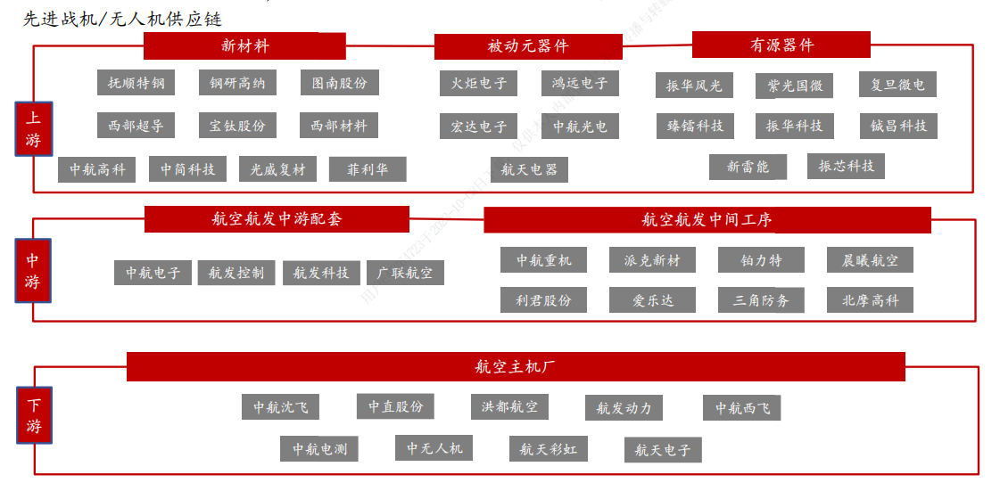 通常,先进战机和无人机供应链上游主要由原材料、被动元器件和有源器件等板块组成。材料又分为纤维、高温合金、钛合金、隐身材料等。中游由航空航发中游配套和中间工序等组成。下游是战机和无人机的整机制造,主要包含战机主机厂和无人机总装厂。