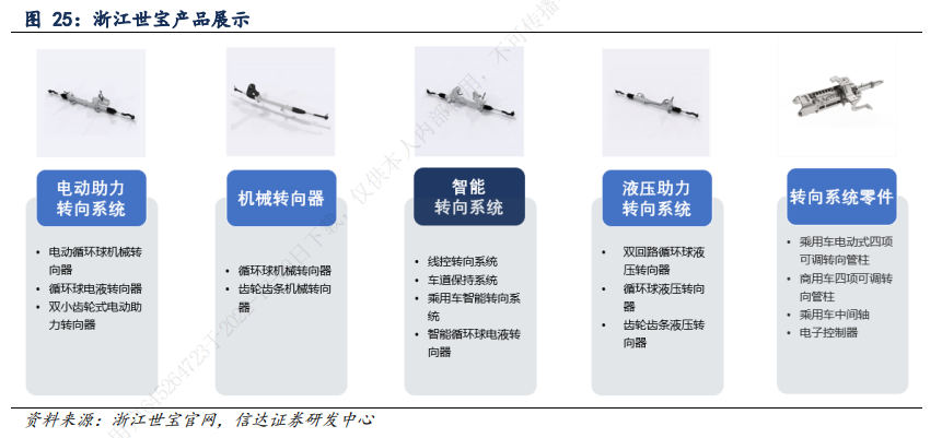 上市公司中,浙江世宝深耕汽车行业三十载,主要从事汽车转向器及其他转向系统关键零部件的研发、制造及销售,在杭州、义乌、四平及芜湖设有5个生产基地,并在北京设有研究中心。目前公司正重点发展高端商用车循环球液压转向器、适用于乘用车和商用车的电动助力转向系统和智能转向系统,为汽车厂提供更安全、更舒适、更智能的转向技术。未来,随着智能化、网联化的持续发展,世宝将加快智能驾驶、无人驾驶相关的汽车转向技术、产品的开发与试制。