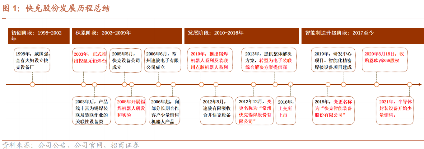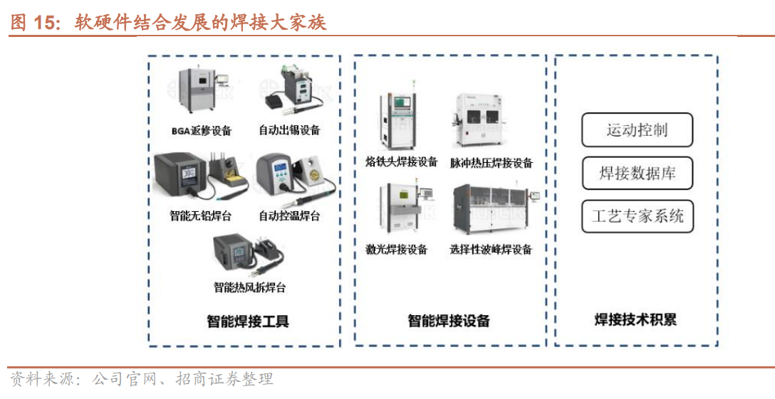 公司专注精密焊接二十余年,生产的通用焊接设备兼具高精度和高良品率,实现了通用型机器对高熟练度工种的替代,是国产电子装联设备实现进口替代的引领者,随后不断拓展产品线,致力于智能制造升级,焊接方面拓展了激光焊、选择焊等设备。