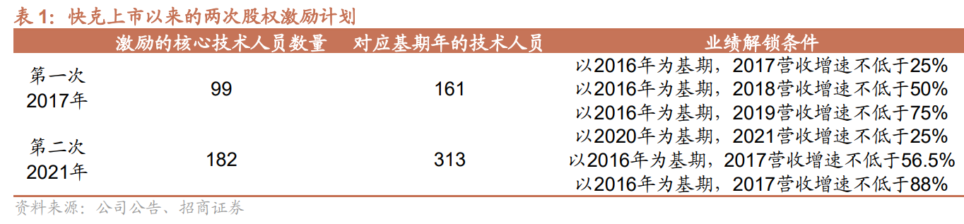 两次股权激励,强化核心技术人才的向心力,同时体现快克的业绩增长信心,上市以来有过两次股权激励,需要注意的是,公司2020年共有313名技术人员,也即本次股权激励计划几乎覆盖超过50%的公司技术人员,也体现了公司对技术研发的重视。