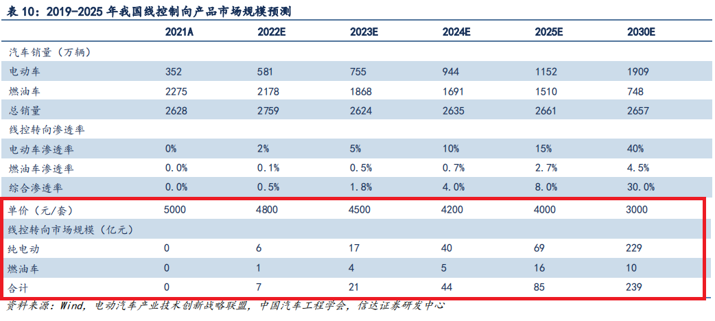 根据2021年我国新能源汽车销量352万辆、线控转向产品单套价格5000元作为建模基数进行测算,机构预计到2025年线控转向系统市场规模将达到85亿元,到2030年有望进一步提升至239亿元,22-30年复合增速达57%。