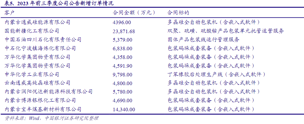 公司截止2023年9月末预收账款+合同负债对应金额16亿元,在手订单较为饱满,2018年以来预收账款+合同负债金额实现稳定增长。智能装备公司产品以销定产,存货科目维持在较高水平,同样反映在手订单充足,近年多晶硅、电石行业成为新增长点。