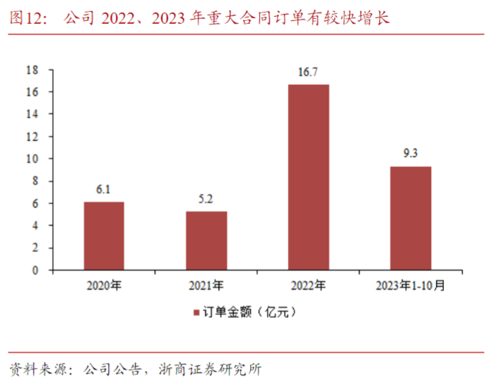 研报菌简评:根据公司公告,2022年新签重大合同订单金额16.7亿元,较2021年增长明显,2023年1-10月金额达9.3亿元。