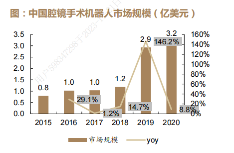 市场规模方面,2020年国内腔镜机器人市场规模为3.2亿美元,15-19年CAGR为39%。从装机量来看,截止2022年11月底,中国有不足17%的三甲医院安装了腔镜手术机器人。从手术渗透来看,全球机器人手术占总体手术比例仅为2%,未来潜在渗透空间大。