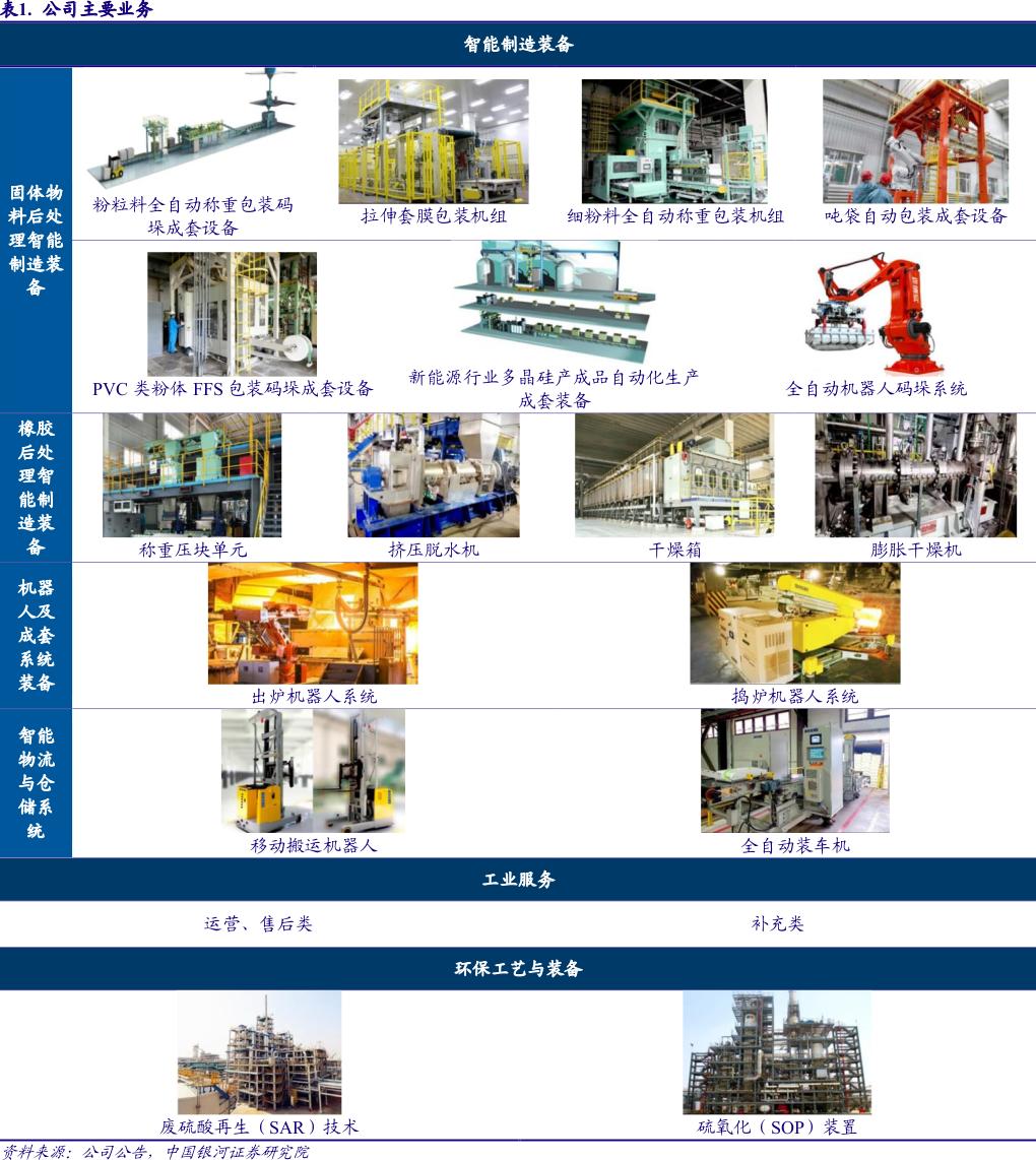 公司业务可分为传统和高成长新业务两类,以智能制造装备及整体解决方案为核心,主营业务包括智能制造装备、工业服务、环保工艺与装备等,智能制造装备产品主要包括固体物料后处理智能制造装备、橡胶后处理智能制造装备、机器人及成套系统装备、智能物流与仓储系统。