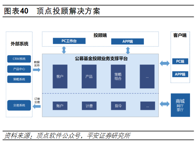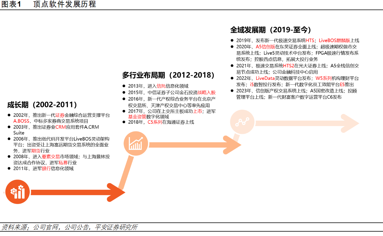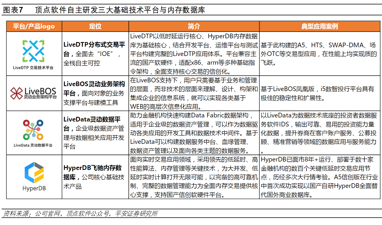 顶点软件:公司自成立以来,始终扎根金融科技领域,专注于自有知识产权软件产品与技术的研发,重点服务于以证券、期货、银行、信托、基金/资管、要素交易市场为核心的大金融行业,为其提供账户、资金、交易、结算、业务运营、营销服务、财富管理、资产管理、合规风控等方面的软件产品及服务。
