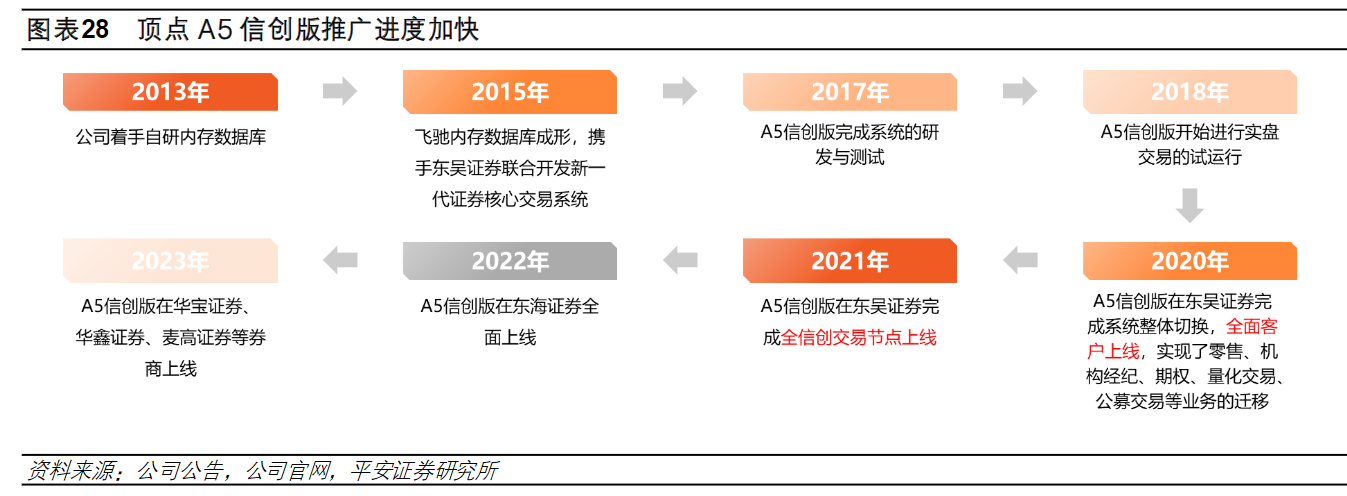 公司坚持信创路线与基础技术研发,持续创新提升竞争力,包括灵动技术中台、证券新一代交易系统A5信创版、分布式交易中间件、“飞驰”内存数据库等一大批自主知识产权和专利的基础技术,形成可与泛金融行业合作伙伴共享的技术生态体系。