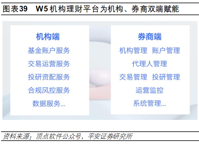 公司通过内生+外延的方式补足财富管理及资产管理产品线的能力,为金融机构投研领域提供投研整体数据整合及一体化投研支撑服务。在财富管理领域延续了CRM以及机构业务方面的优势,W5平台由投研资配、顾客服务、销售与交易、运营管理、投资与理财端五大方面构成,目前取得较快推进。