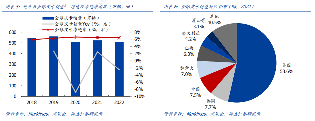 2022年,全球皮卡销量超510万辆,渗透率超6%,美国是全球最大的皮卡市场,占据全球过半销量。中国则是全球第三大市场,国内需求约40万辆水平,由家用和商用需求共同驱动增长。近年来在路权放宽、进城解禁等诸多政策利好拉动下,需求正加速释放中,未来销量仍有提升空间。