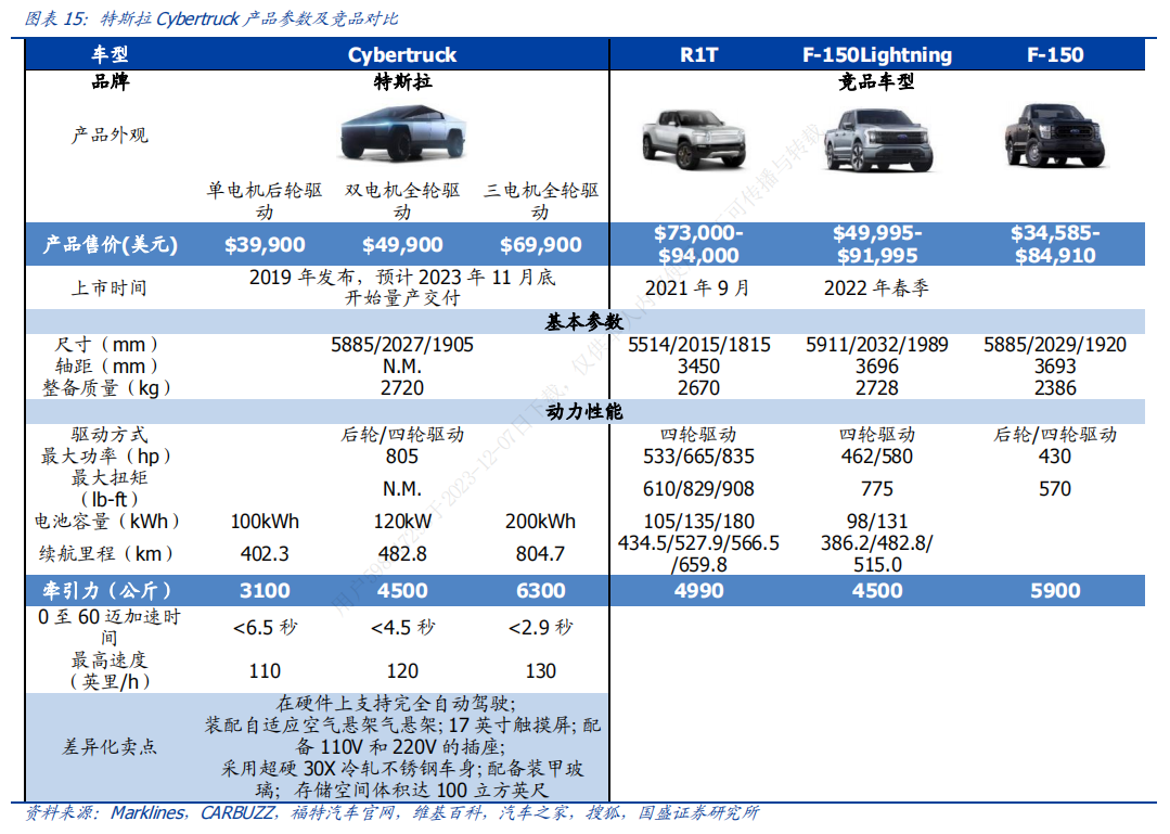 在兼具越野功能和舒适性的中高端车型中,特斯拉于2019年首次推出的纯电动皮卡车型Cybertruck独树一帜。近期,在其交付会上,我们可以看到,Cybertruck有别于传统皮卡,在造型设计上具有极强的科技感,并搭载诸多创新技术,包括超硬30X冷轧不锈钢车身、装甲玻璃等,突破了以往传统燃油皮卡动力极限,可以实现0至60英里/小时加速最快仅2.9秒及最高6.3吨的超强牵引能力,自动驾驶能力在同类竞品中也处于领先地位。