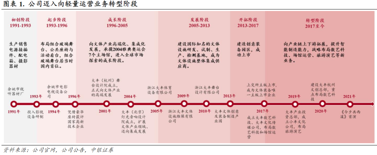 大丰实业:公司是集文体旅创新科技和文体旅赋能服务于一体的平台企业。聚焦文化、体育、旅游产业,创新科技,打造文体旅核心科技装备和系统;赋能服务,提供文体旅空间的策划、创意、智造、投资、运营服务。大丰连续24年创制央视春晚舞台系统,为全球华人的文化盛宴提供核心科技,引领中国文化发展的风潮。