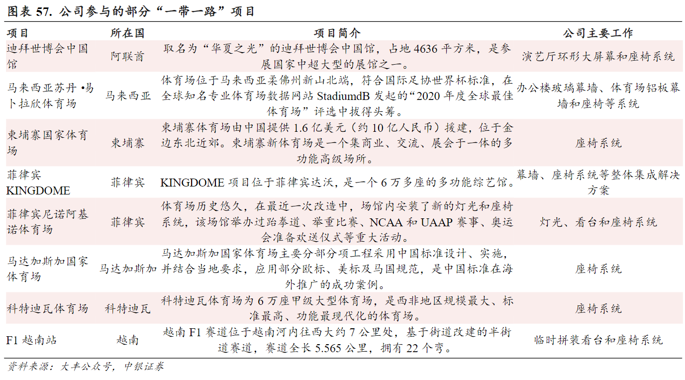 公司响应“一带一路”倡议,积极拓展海外业务,在沿线国家完成交付了多个订单,使大丰品牌顺利扬帆海外。目前,“一带一路”国家正处于基础设施建设的高速增长期,文体场馆建设需求较为充足,公司在海外的积极布局,有望带来进一步的市场拓展空间。