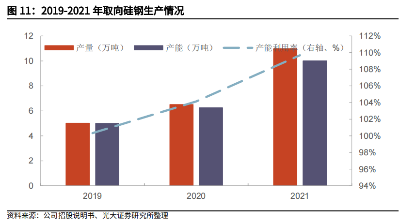 上市公司中,望变电气是民营取向硅钢龙头,拥有从取向硅钢到变压器的一体化产业链。2021年公司取向硅钢产能达到10万吨,产量达到10.97万吨(全国第三,仅排在宝钢和首钢之后,在民营企业中位列第一),同比增长68.5%,其中高磁感取向硅钢占总产量比重为10%。