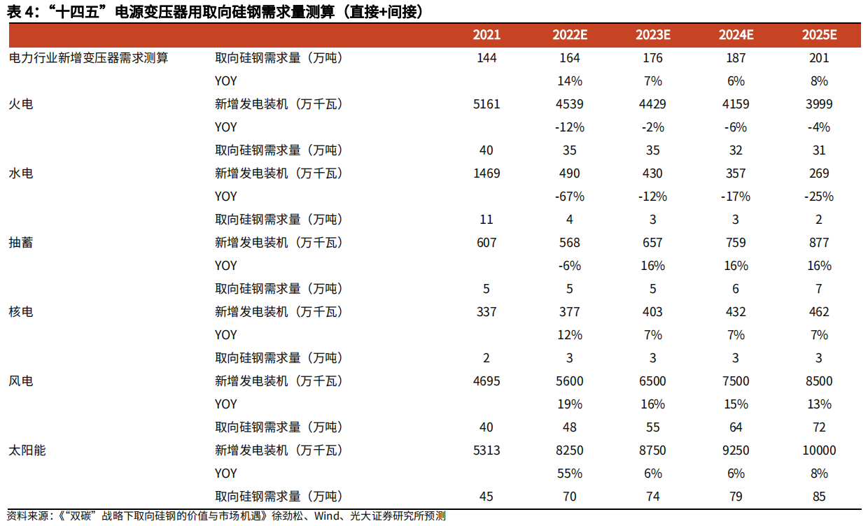 基于中电联等机构预测,结合“十四五”期间我国发电结构以火电、水电、核电、风电、光伏为主体,对于2022-2025年我国新增电网装机容量带动的取向硅钢需求计算,得出2022-2025年我国新增发电装机容量对取向硅钢需求量分别为164、176、187、201万吨,同比增加分别为14%、7%、6%、8%。其中光伏、风电新增装机容量对取向硅钢需求拉动作用逐步提升,占当年电力行业新增变压器对取向硅钢需求量的比例从2021年的59%提升到2025年的78%。