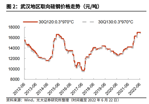 数据显示,1-5月我国取向硅钢累计出口量达到16.1万吨,同比增长52.1%。价格相比2月出口均价上涨14.2%。截至6月22日,武汉地区取向硅钢30Q130价格上涨至16800元/吨,较2021年12月31日上涨5%,创2012年以来新高水平。