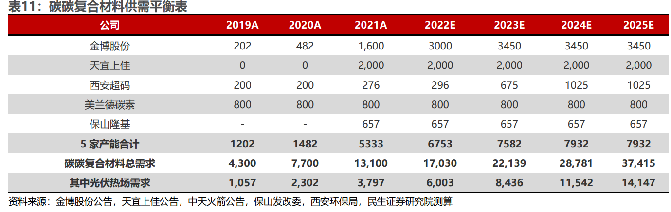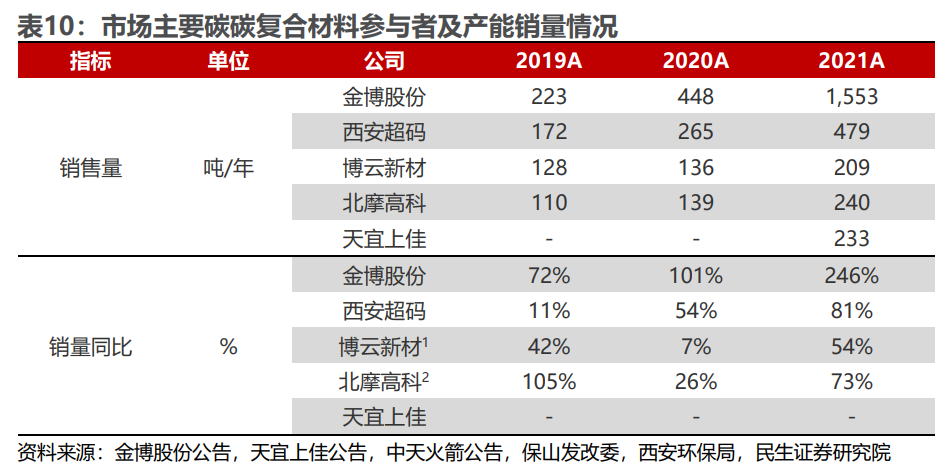 碳碳复合材料市场格局紧俏供需关系紧张,从公司2021年销量来看,天宜上佳233吨供不应求,天宜上佳目前已投产2,000吨/年产能,扩产周期开启,以满足光伏热场材料需求。