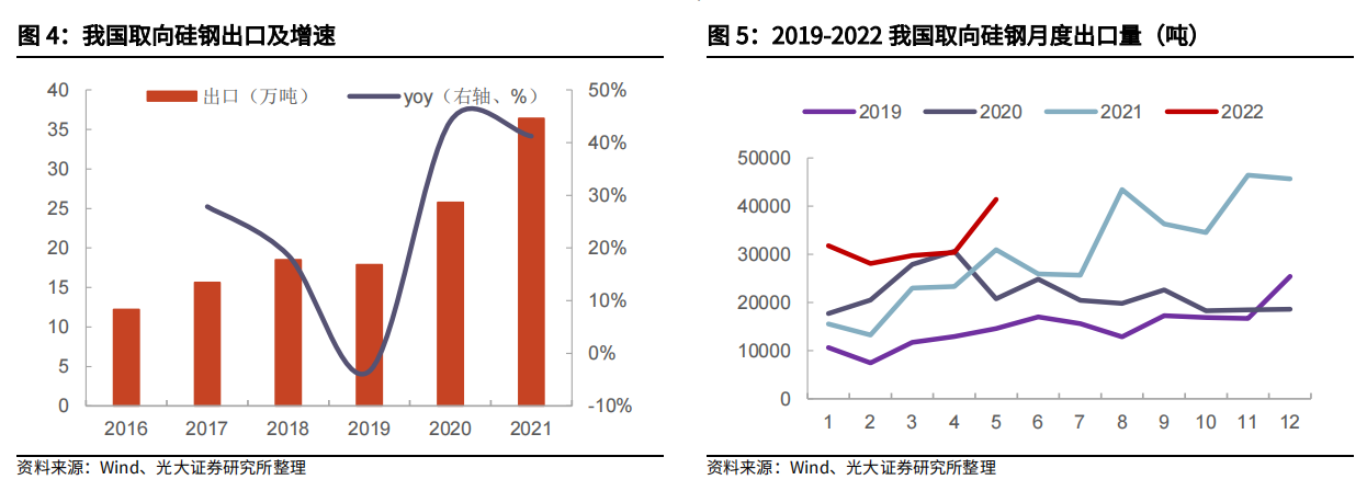 供给侧,中国是世界上最大的取向硅钢生产和消费国。2021年我国取向硅钢出口量达到36.38万吨,同比增幅41.2%,2022年以来,受俄乌冲突影响,俄罗斯四大钢铁公司之一新利佩茨克钢铁公司(NLMK)取向硅钢产品出口(全球市场占比达到8.4%)受到影响,市场供应出现缺口,我国取向硅钢出口量趁机而上,直逼历史同期最高水平。