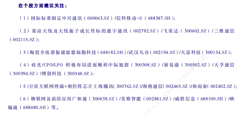 产业链布局方面,天线、滤波器、功率放大器、PCB等环节都有望随着6G的推进和发展迎来量价齐升。相关零部件的用量和材料的精细化也将迎来升级。基于6G的整体研究节奏,机构认为6G的关注或提前到来,优先布局6G产业的公司有望在新一轮通信浪潮下率先受益。上市公司投资机会方面,梳理产业链相关企业,主要对标如下: