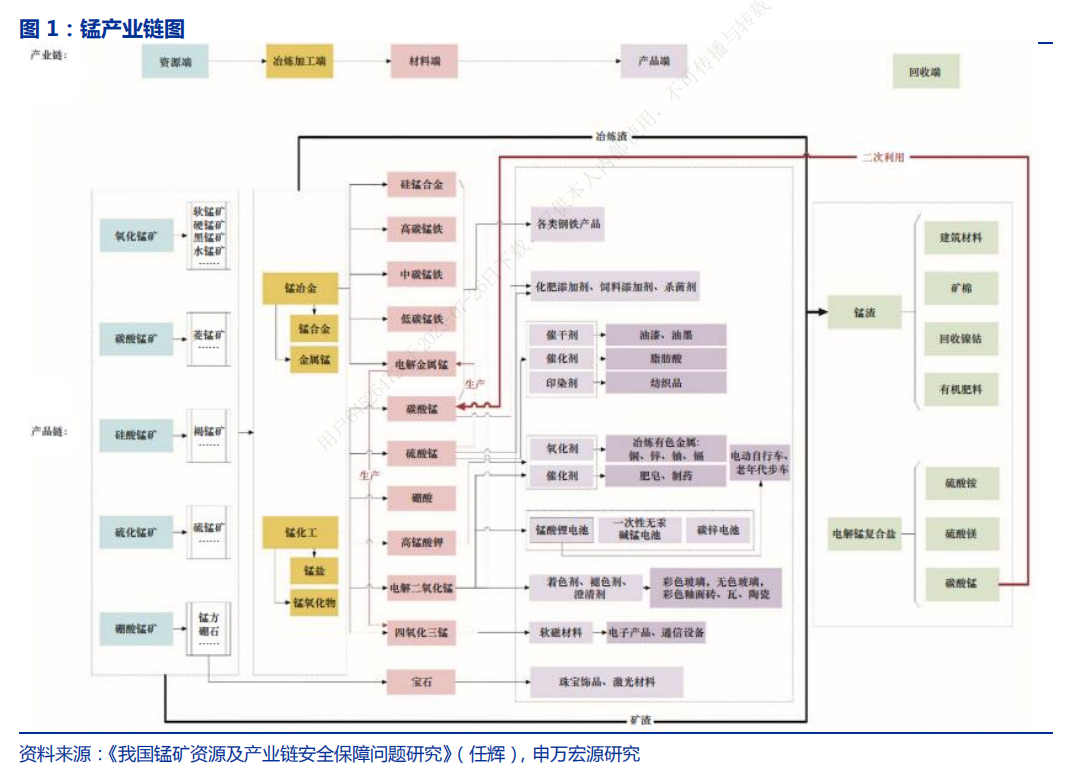 锰作为一种重要的金属元素,在钢铁、化工、电子等行业中有广泛的应用。产业链来看,主要分为上游矿石采选,中游加工和下游应用。全球锰矿集中于南非、中国、澳大利亚和巴西,中国锰矿储量居世界第二,但优质品位资源主要集中在海外。