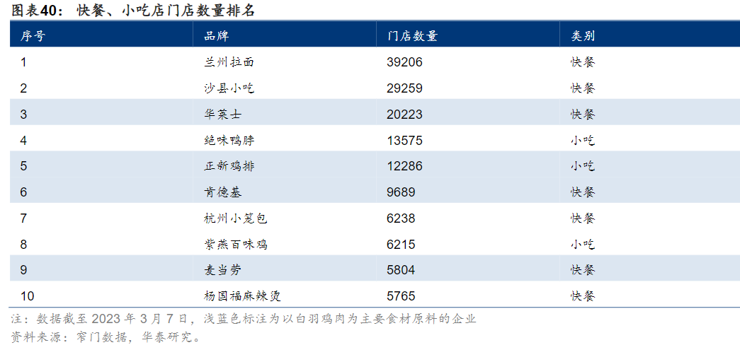 公司在餐饮端深耕多年,经过近20年的积累和发展,已探索出具备圣农特色的餐饮业供应链优势,拥有诸多重要的合作伙伴,目前B2B传统优势渠道覆盖出口、大餐饮、中小餐饮、团餐等多种类型,且与头部形成战略合作。由于国内白羽鸡鸡肉食材供应链较为成熟、稳定,且鸡肉食材具有广泛的普适性,并具备易加工和标准化等特点,白羽鸡肉食材备受连锁餐饮青睐,在排名前十的全国快餐/小吃店中,共有4家以白羽鸡肉类食品为主,公司为每个B2B渠道配备了专属的研发团队,依托公司完整的产品生产线,建立长久发展的支撑体系。