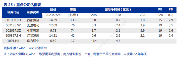 上市公司投资机会方面,西部黄金有“黄金+锰矿”采冶双主业经营。公司长期从事黄金采选冶业务,完成重大资产重组后,增加了锰矿石开采、电解锰生产加工,主要产品为标准金、电解金属锰和锰矿石。另外,湘潭电化深耕电解二氧化锰,专研锰系电池材料生产。据2022年报,公司电解二氧化锰产能12.2万吨,在细分领域优势突出,产能规模居行业前列;锰酸锂产能2万吨,产能规模居行业前列。