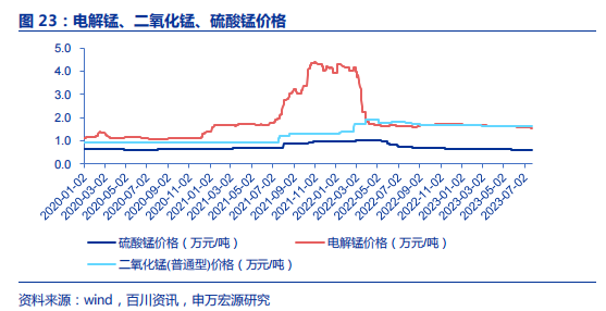 价格端,当前锰矿、硫酸锰、电解锰价格处于历史相对低位,二氧化锰价格处于历史相对高位。2021年能耗双控、电力短缺背景叠加协会联合停产,电解锰供给减少,价格大幅上涨,带动锰矿、硫酸锰、电解锰价格上涨,2022年后下游需求走弱电解锰价格下降,而二氧化锰、硫酸锰等因下游锂电池景气度仍存,价格回调幅度不大。长期看下游需求主要为电池的硫酸锰、二氧化锰受益于锰基正极材料放量,价格中枢有望上移。