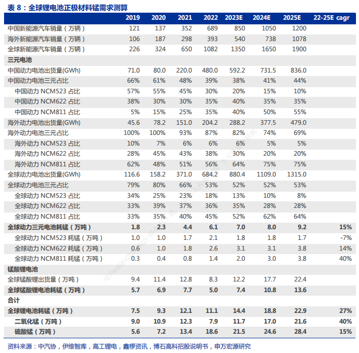 具体来看,锂电池正极材料用锰主要分为三元电池用锰和锰酸锂电池用锰。未来伴随动力三元电池、锰酸锂电池出货量增长,预计22-25年全球动力三元电池耗锰量由6.1万吨增长至9.2万吨,对应硫酸锰需求量由18.6万吨增至28.4万吨(三元电池正极材料锰源为硫酸锰);受电动两轮车需求增长驱动,预计25年全球锰酸锂正极出货量为22.4万吨,对应耗锰量13.6万吨,对应二氧化锰需求量21.6万吨(锰酸锂正极材料锰源为二氧化锰)。