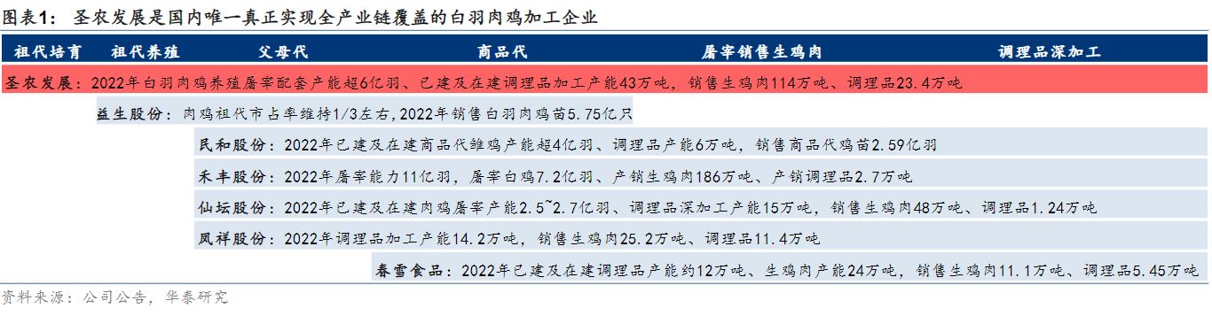公司属于白羽肉鸡生产及肉类食品深加工行业,是我国白羽肉鸡行业龙头,现已形成了集饲料加工、种源培育、种鸡养殖、肉鸡饲养、肉鸡屠宰加工与销售、调理品加工与销售为一体的完整白羽肉鸡产业链。在布局调理品深加工业务的主要白羽肉鸡企业中遥遥领先,圣泽901占2022年国内祖代更新量约25%、并具备了1750万套父母代种鸡雏的年供种能力,是国内唯一真正实现全产业链覆盖的白羽肉鸡加工企业。