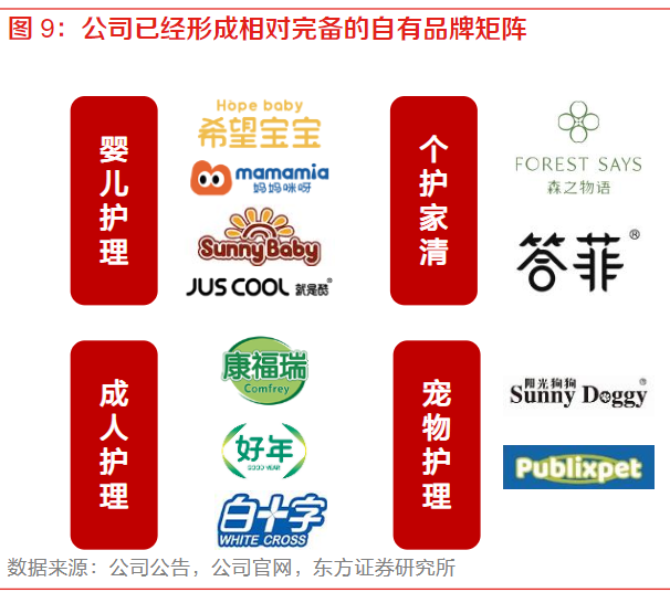 公司作为国内领先的个人护理用品制造商,抓住市场机遇,加强自主品牌建设,2017年开始加大自主品牌布局力度,目前已形成了相对完备的自有品牌矩阵,覆盖婴儿护理、成人护理、女性护理三大系列,持续完善品牌运营体系。