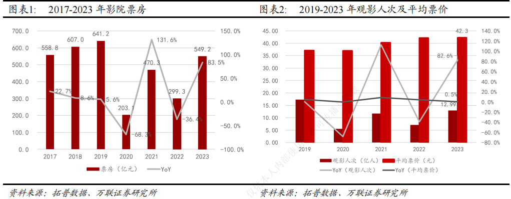 从票房来看,在疫情消退、供片充足、头部国产影片发力等多重有力因素带动下,2023年电影总票房同比上涨83.5%,达到了549.2亿元,回到了2017年水平。从观影情况来看,观影人次及平均票价均有不同程度的上涨。其中,观影人次同比上涨82.6%至12.99亿人次;票价则处于维稳态势,微幅上涨0.5%。