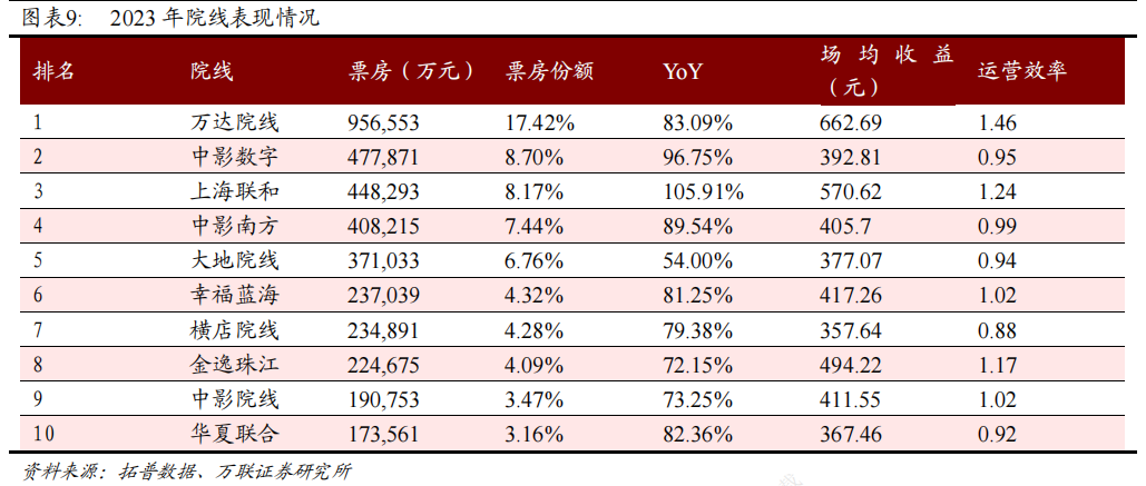 院线表现来看,万达院线持续稳固龙头地位。2023年万达院线票房为95.66亿元,同比增加83.09%,票房份额占比达17.42%,运营效率达1.46,远超同行,位居市场第一。