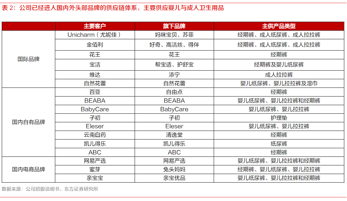 豪悦护理:公司是国内个人卫生护理用品领域的制造商,专注于妇、幼、成人个人卫生健康护理用品的研发、制造与销售业务。经过多年发展业务已涵盖婴儿纸尿裤、成人纸尿裤、经期裤、卫生巾、湿巾等一次性卫生用品产品,与多家全球500强企业及国内知名品牌商建立了长期的合作关系。