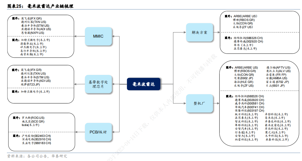 产业连方面,毫米波雷达上游射频MMIC芯片、高频PCB、处理芯片以及后端算法等相关企业,中游包括成品毫米波雷达的生产企业,下游则为主机厂。MMIC芯片目前主要来自恩智浦、英飞凌、德州仪器、Mobileye等海外芯片设计公司,我国国产实力相对薄弱,国内厂商有加特兰微电子、清能华波、矽杰微电子等。上游PCB方面,主要企业包括Rogers、Isola以及国内的沪电股份、生益电子、深南电路等。
