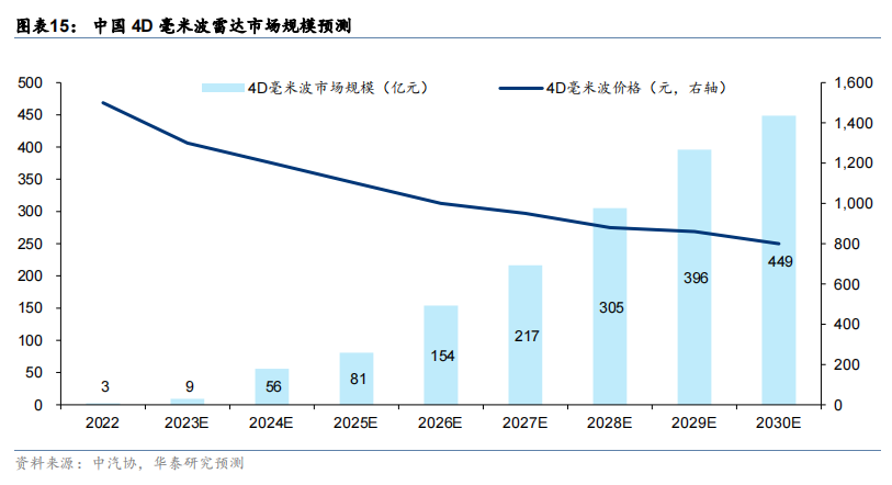 成本来看,MMIC(包括发射、接受、及信号处理器)的成本约占50%、PCB(包括接收、发射天线)的成本约占20%,两者构成了4D毫米波雷达的主要成本,也是未来降本的关键领域。随着技术的不断迭代升级,降本增效大势之下未来有助于4D毫米波雷达的量产上车,机构预测2030年中国4D毫米波雷达市场规模有望达到449亿元。