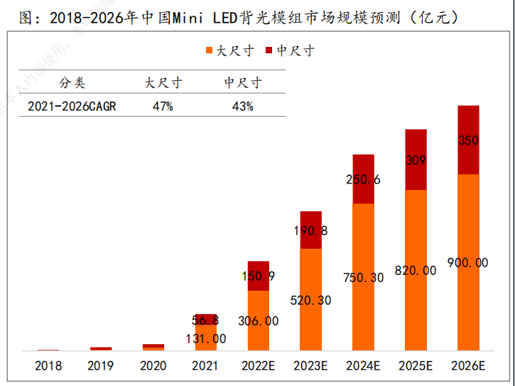 市场空间方面,受益于行业景气度及产能扩张,MiniLED产值高速增长。根据亿渡数据,2021年中国LED产值约为7280亿元,预计2026年将增长到9291.45亿元,预计2026年MiniLED背光模组市场空间将达到1250亿元,其中大尺寸背光模组市场规模为900亿元,中尺寸背光模组市场规模为350亿元。