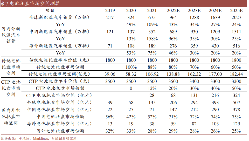 全球电动化趋势下,新能源汽车销量快速提升,由此也带动了配电电池托盘市场规模的大幅增长。按照电池托盘需求量与新能源汽车产量相等计算,预计2025年中国电池托盘市场空间约378亿元,年复合增速达26.53%;全球市场空间超500亿元,年复合增速达25.18%,中国市场份额为75%左右。