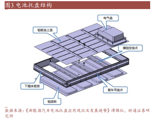 电池托盘作为电池系统的骨架,是电池系统安全性的重要保障。其主要由下托盘、上盖以及其他零部件等构成,重量占电池系统的20%-30%左右。