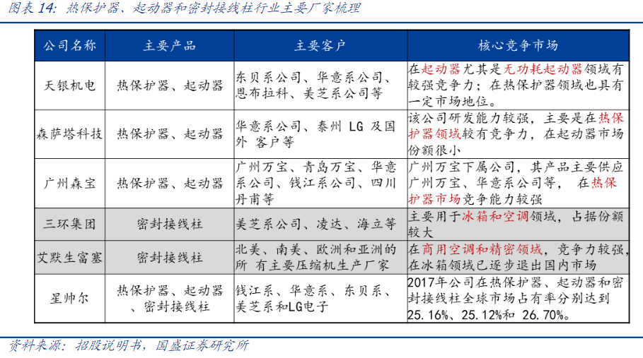 星帅尔:公司是国内电动机热保护器、起动器行业的著名企业之一,尤其是本公司生产的压缩机用热保护器、起动器在国内市场有较高的占有率,已成为国内压缩机两器生产和出口的主要基地,并拥有多项自主知识产权,产品销往欧美、中东、东南亚及国内的主要压缩机厂家。质量在同行中名列前茅。