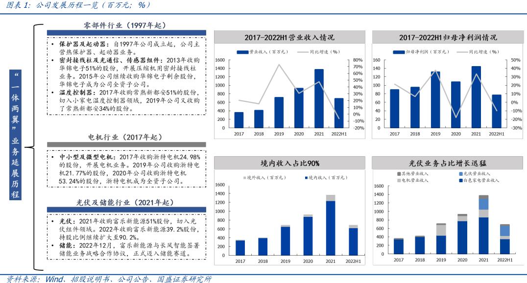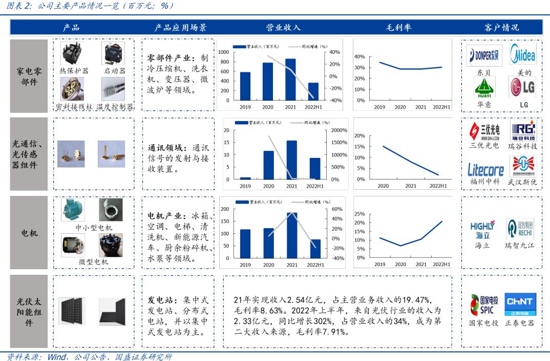 近年来公司以压缩机配件为主线拓展品类,先后在2013年、2017年收购华锦电子、浙特电机,引入密封接线柱及电机产品,同时进入新能源汽车、清洗剂、厨余粉碎机等领域;2017年公司收购主营温度控制器的新都安,借其切入小家电行业。
