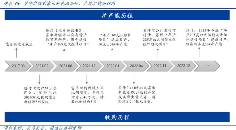 收购富乐新能源,战略扩张光伏领域。富乐新能源成立于2017年,但收入规模增长受限于资金、产能问题。星帅尔审时度势,分别于2021年、2022年进行两次股权收购,最终实现对富乐新能源90.2%控股;同时不断投资建设扩产项目,产能步步攀升,预计未来将实现年产能1.5GW到5GW的飞跃。公司光伏组件业务营收占比由2021年的18.56%提高至2022年上半年的33.88%,扩产能推动业务规模快速扩张。