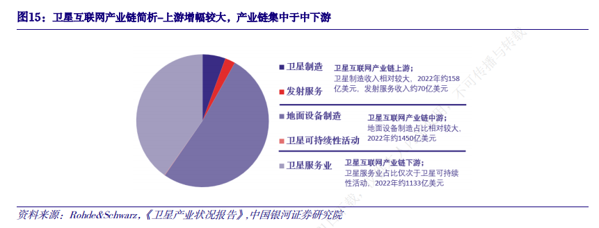 产业链方面,卫星互联网产业链可以拆分为上游卫星设计制造和发射、中游地面设备制造及卫星通信运营和下游卫星应用三个环节。产业链价值方面,根据《卫星产业状况报告》,2022年全球卫星产业收入约2810亿美元,主要价值量集中在产业链中下游。