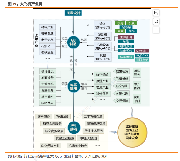大飞机制造环节可分为机体、发动机、机载设备、其他(材料及标准件等)四个主要部分。一般而言,机体、发动机和机载设备作为高技术模块,其价值占比分别可以达到25%以上。另外,新材料在大飞机产业中也具有重要地位。