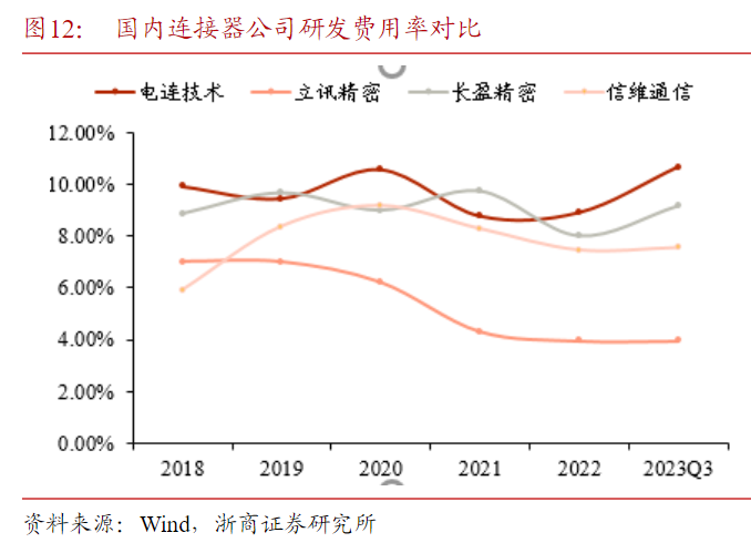 公司注重研发投入,期间费用控制良好。2023年前三季度研发费用率为10.69%,有较强的研发能力,能够快速响应新产品及提升自动化、精密化水平,国内连接器行业里,公司的研发费用率属于领先地位。