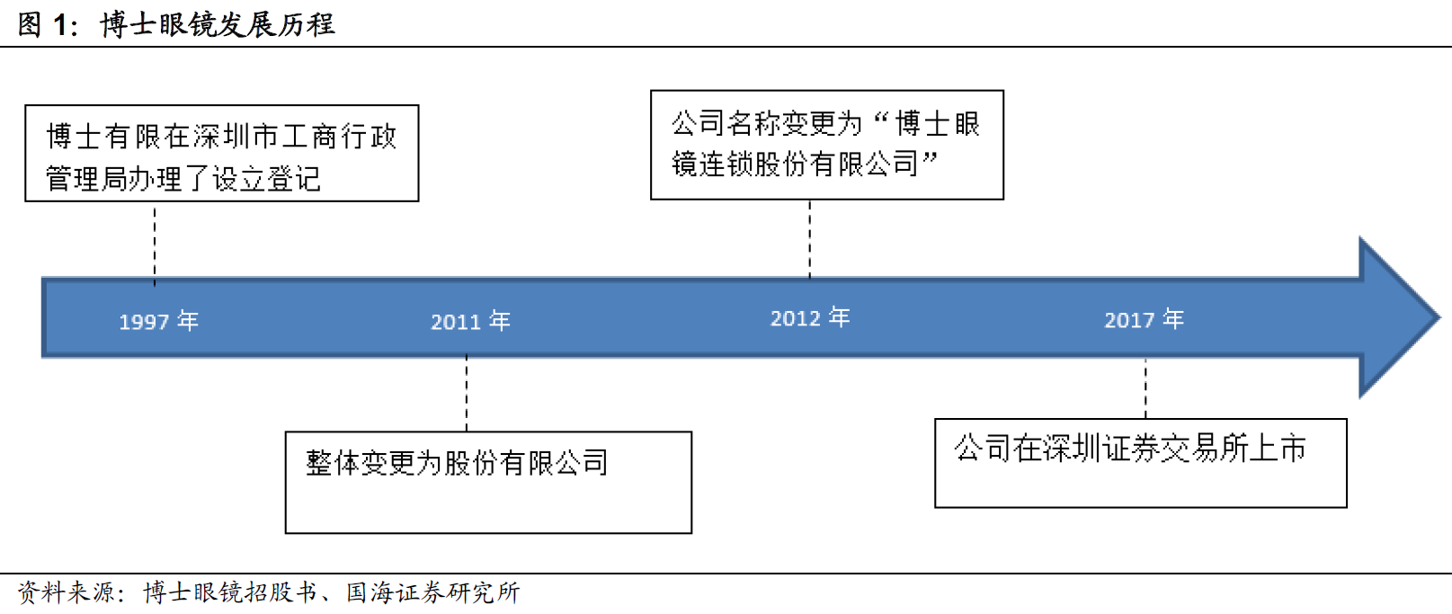 1997年,博士有限在深圳设立,2011年,公司整体变更为股份有限公司,2017年,公司在深圳证券交易所上市。公司深耕行业二十多年,国内首家眼镜零售上市公司,是一家从事眼镜零售的连锁经营企业,